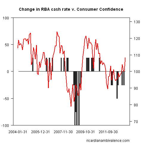 As you can see from the above chart, the RBA typically cuts when the index is below average, and hikes when it is above average. Why is this? Well, i think it’s because consumer confidence is a reasonable first approximation at a weighted average of the economy’s state. If we had been looing at all the data, it wouldn’t tell us anything new, but if we’d not seen it (or didn’t know how to weigh it all up) we would find the series helpful.