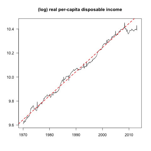 This is where i think folks like Sumner are on the money — that income growth has not met (reasonable) pre-crisis expectations is depressing activity and demand. The trend for real pre-capita income growth used to be ~2%y/y — but since 2008, there’s been basically no growth at all.