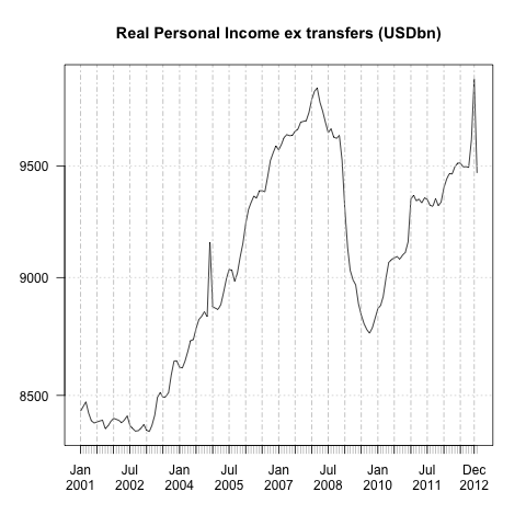 The drop in personal income looks recessionary, but it’s not as bad as it looks. The move is exaggerated by folks having pulled forward income into Q4’12, in part to beat the tax hikes. Smoothing through all this, income (excluding transfers) probably remains about 4% below the pre GFC peak.