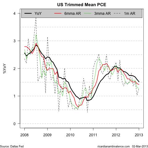 Being Australian, i prefer statistical exclusion measures, and these are also low. Trimmed mean PCE is also low — but not quite as low. In January, trimmed mean PCE was ~1.3%, which is around the average over the prior three months, and a little below the prior trend (6mma AR is 1.4% and 12mma AR is 1.5%). This reflects the absence of headline commodity price driven inflation pressures.