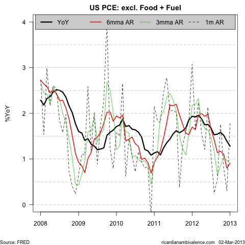 There is a hint of residual seasonality even in the seasonally adjusted PCE deflator. After a period where core PCE inflation has been low, the core PCE deflator picked up a to 1.8% AR. An acceleration is common in January (the AR was 3.1% in Jan’12 and 2.2% in Jan’11). Over the prior three months, core inflation has been running at ~1%y/y, and over six months, core inflation has been running at ~0.9%y/y. The Fed’s target is 2%, so this is clearly too low.