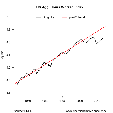 The general extension of average hours, and increase in employment has boosted aggregate hours — relative to total jobs, it is a little closer to the prior peak.