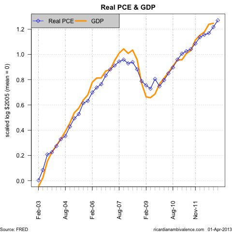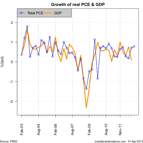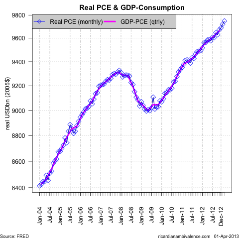 We can be fairly sure of this, as the monthly PCE report is basically the same thing as the quarterly series used in GDP (I’ve used the mid-quarter months to match against the quarterly data in the above chart). The quarterly data is a little smoother, but it’s not so different that we ought to doubt the apparent acceleration of consumption growth from November’12.