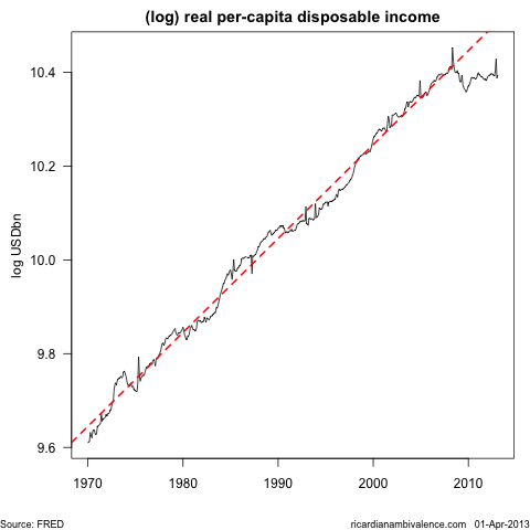 Despite 3.5 years of ‘recovery’ real disposable income remains almost 6% below the pre recession peak — and while this was a little inflated it’s ~2% below the pre GFC trend.