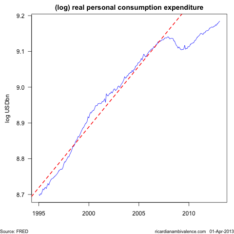 Of course, that’s not to say that that the US is anywhere near closing the yawning and massive output gap. Relative to the 1996-2008 trend, the ‘consumption-gap’ remains massive — which is why unemployment remains high.