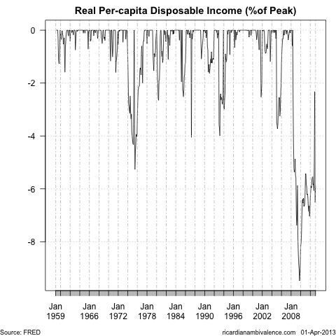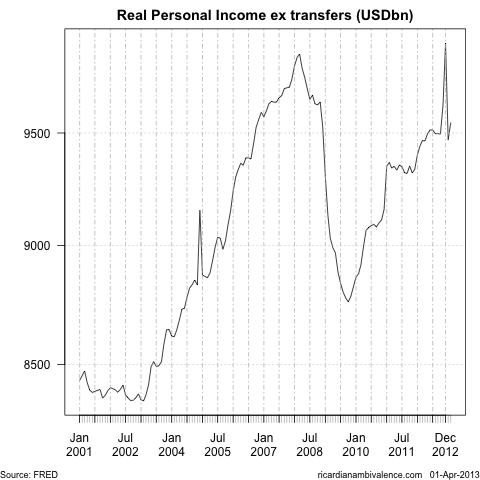 By the way, I love the peaks in these charts — they show the power of incentives. The ~500bn (SAAR, or 40bn in the month) income spike in December was due to the bring forward of income to beat tax hikes — incentives clearly matter!