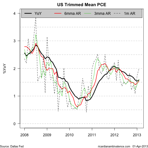 Inflation trends remain subdued, even including some evidence that there has been a very recent pick up. Trimmed mean PCE inflation in Feb was running ~2% SAAR, however the 6m average (the best measure) remains around a 1.5%y/y pace.