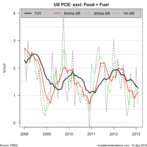The more ‘American’ exclusion based measure the Fed prefers is even more subdued, showing little core inflation pressure: the Feb reading was arguably too low at ~0.7% SAAR (something Hilsenrath has noted). This took the annual pace of core inflation down to ~1.25%y/y (3m and 6m averages are ~1.1%y/y).