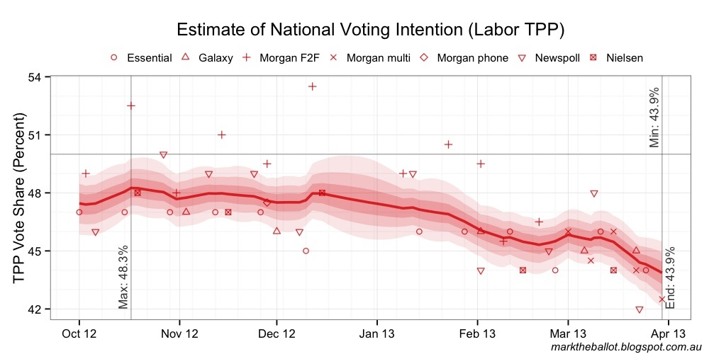 Mark’s analysis of recent polls suggests the ALP will win only 44% of the two-party-preferred vote.