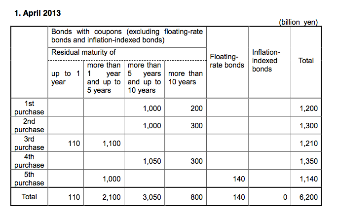 The Japanese Business paper Nikkei reports that the Bank of Japan will kick off their easing campaign with Y1.2tn of JGB purchases this week. The indication is that their purchase programme will be a reverse tender process — just like the one the Fed has used.