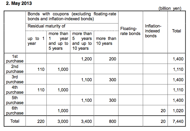 In April, the BoJ plan on buying ~Y6.2tn of JGBs in five OMO. The above schedule shows that it will be mostly in the 5yr to 10yr sector. In subsequent months, there will be six OMOs, and purchases will be ~Y7.5tn (the May schedule, below, shows ~Y7.4tn per month, with the majority in the > 5yr bucket).