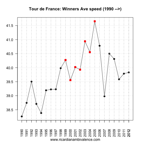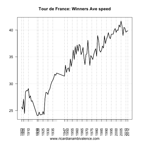 Looking at the long sweep of tour average speeds, it’s hard avoid the sense that folks have been ‘cheating’ for some time — and that they continue to do so. The sharp up-trend from the 1980s to 2005 includes both the move to ‘professionalism’ and the better application of science in sport — but I find it hard to believe that the drugs the riders were all on in 2005 were only worth ~2km/hr, and that the rest of the gain has been sustained as it comes from better science.