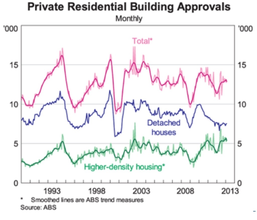 By the way, the change in domestic house prices over 2012 suggests that the RBA was still tight mid year when policy was 4.25%. Looking back, neutral seems to have been ~3.5%