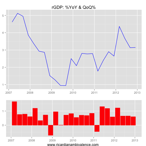 Remembering that the Q1 SOMP was published a month before the Q4’12 GDP data, we can peg the last observation (Q3’12 GDP) at 3.1%y/y. We have since learned the Q4’12 GDP was also ~3.1%y/y, which was a little lower than the RBA had expected.