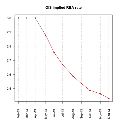 The RBA meets for their regular monthly meeting tomorrow (on Tuesday 7 May), and the market is split evenly on the outcome. A bare majority of economists expect rates to stay on hold, and market pricing is exactly 50/50 for May, with a cut priced as a certainty by June. Current pricing suggests that their cash rate will fall below 2.5% some time in Q4’13.