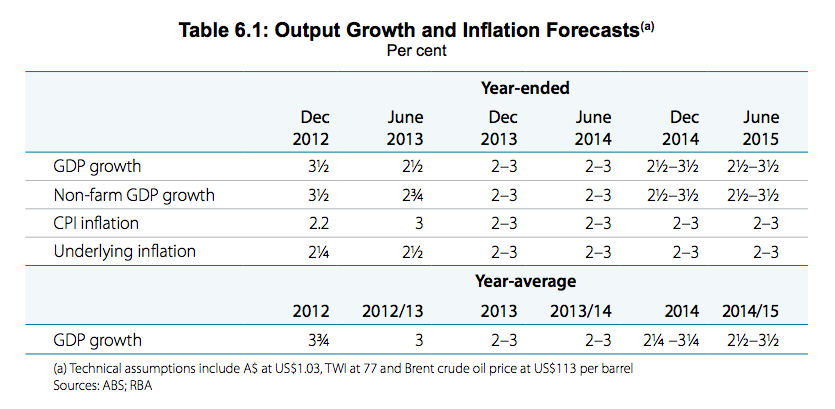 The RBA’s most recent demand forecast can be found in chapter six of their Q1’13 SOMP. This reports a forecast for real GDP of 2.5% for the year to June, and 2.75% for non-farm GDP.