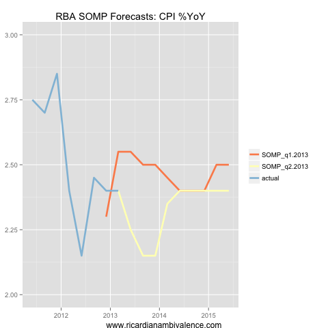 The RBA today published their Q2 2013 SOMP. The bottom line is that every meeting is live, but i think they are more likely to await the Q2 CPI data before easing further. If there’s some bad demand side data, they could cut at any meeting, however if it’s just a case of (more) plodding growth, they’ll likely await the CPI reports and cut if inflation remains low.