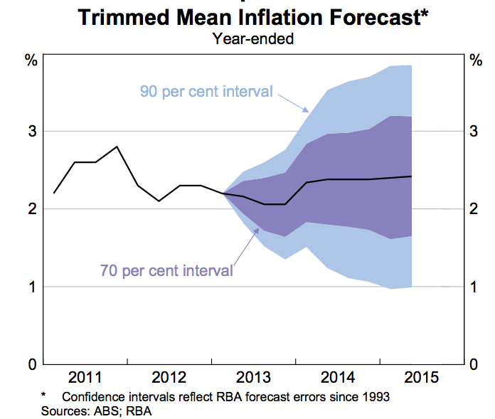 Core CPI inflation is forecast to fall to ~2.15%y/y later this year which is way too low (note: this chart shows average core CPI, unlike the above RBA core CPI fan-chart, which shows trimmed mean inflation; trimmed mean inflation is below average core, and touches ~2% in 2013 as trimmed mean CPI was ~20bps lower than weighted median CPI in Q1 2013).