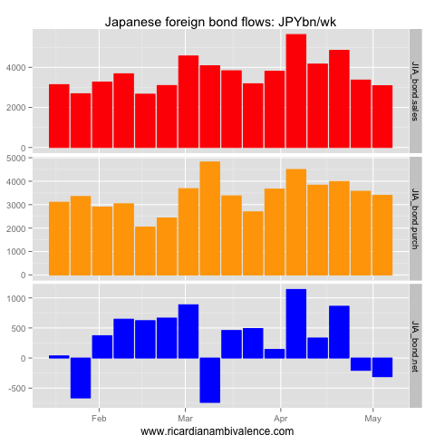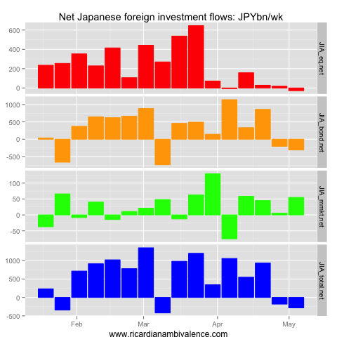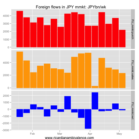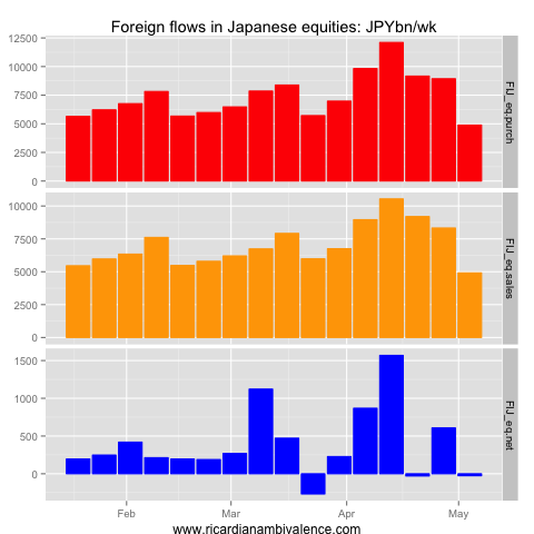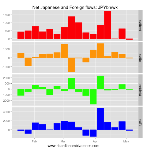 This flow picked up to Y1tn/week in mid March, and is now ~Y500bn/wk (it was a depressed Y250bn/wk in the most recent week). Other the other side, Japanese purchases of foreign equities have been ~Y500bn/wk, which has flattened out the net flow (it was a net outflow of Y28bn last week).