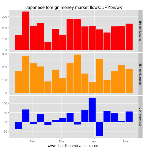 Net-net across assets, capital has flowed out for the first time in over a month: the outflow for the week ending 4 May 2013 was a modest JPY166bn. There has been a change in all three asset classes, with net outflows in bonds (JPY54bn), equities (JPY43bn), and money market instruments (JPY69bn).