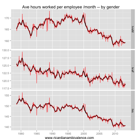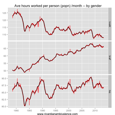 The gross flows data has some decent signs, and they suggest that there is a recovery in train. The labour market is stabilising if you have a job — however if you are unlucky enough to be unemployed, it remains tough to find work (this bit tends to pick up with a lag). Average hours worked remain low, both in terms of population and those who are in the labour force.