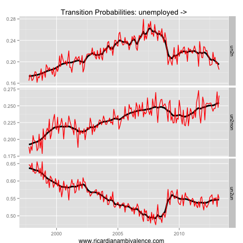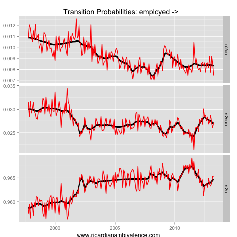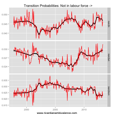 The interesting action this cycle has mostly been in the not-in-the-labour-force dynamics. You can see this from the lower than usual probability of remaining out of the labour force if you have exited (~92%).