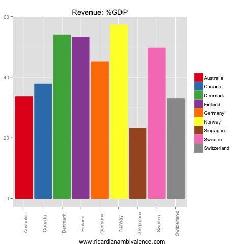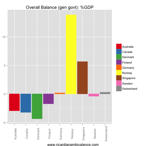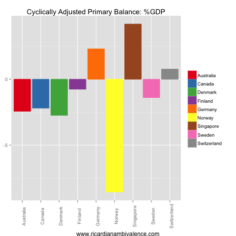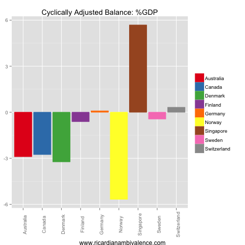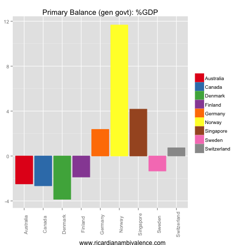 After adjusting for the economic cycle (but not the possibility that high commodity prices are cyclical), Australia’s cyclically adjusted primary balance clocks in at -2.4% of GDP. Only Denmark is worse (-2.7%); Canada (-2.2%), Finland (-0.8%) and Sweden (-1.4%) are comparable nations that are doing a little better; Switzerland (+0.8%) and Germany (+2.3%) are doing much better — and Singapore (4.2%) and Norway (-8.6%) are special cases.