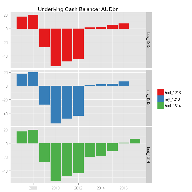 The 2013-14 budget has been released, and it shows the (fairly) predictable consequences of the decline in the terms of trade. Gone are the surpluses, and in their place we have ~60bn more of deficits. That’s a lot of extra deficit, given that the MYEFO forecasts are barely six months old, and given that neither the AUD nor the terms of trade have moved by all that much in that time …