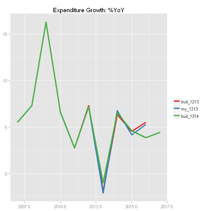 There has also been insufficient restraint on the expenditure side. You can see the consequences of the ‘shuffling’ that was attempted to push the budget back into surplus in 2012-13, with spending growth bouncing from -1%y/y to +6.5%y/y in 2013-14 as the government ‘breathes out’.