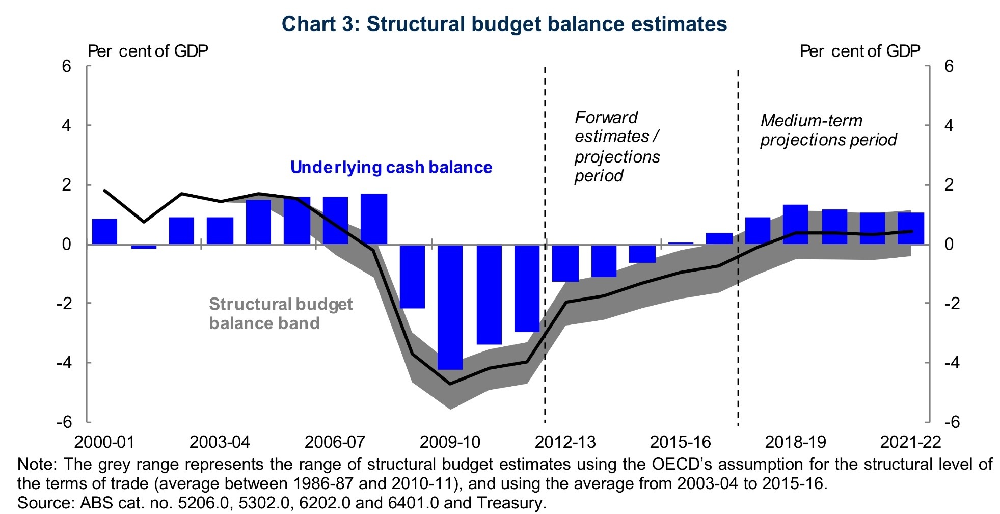 So, while we have a deficit of ~1.1% of GDP forecast for 2013-14, in terms of the underlying cash balance (or 1.5% of GDP using the headline cash balance, which we probably should use given that there is no way the NBN or CEFC are ‘financial investments’ worth book value), the structural position is said to be something like a deficit of ~2% of GDP (the band is 1% to 3%).