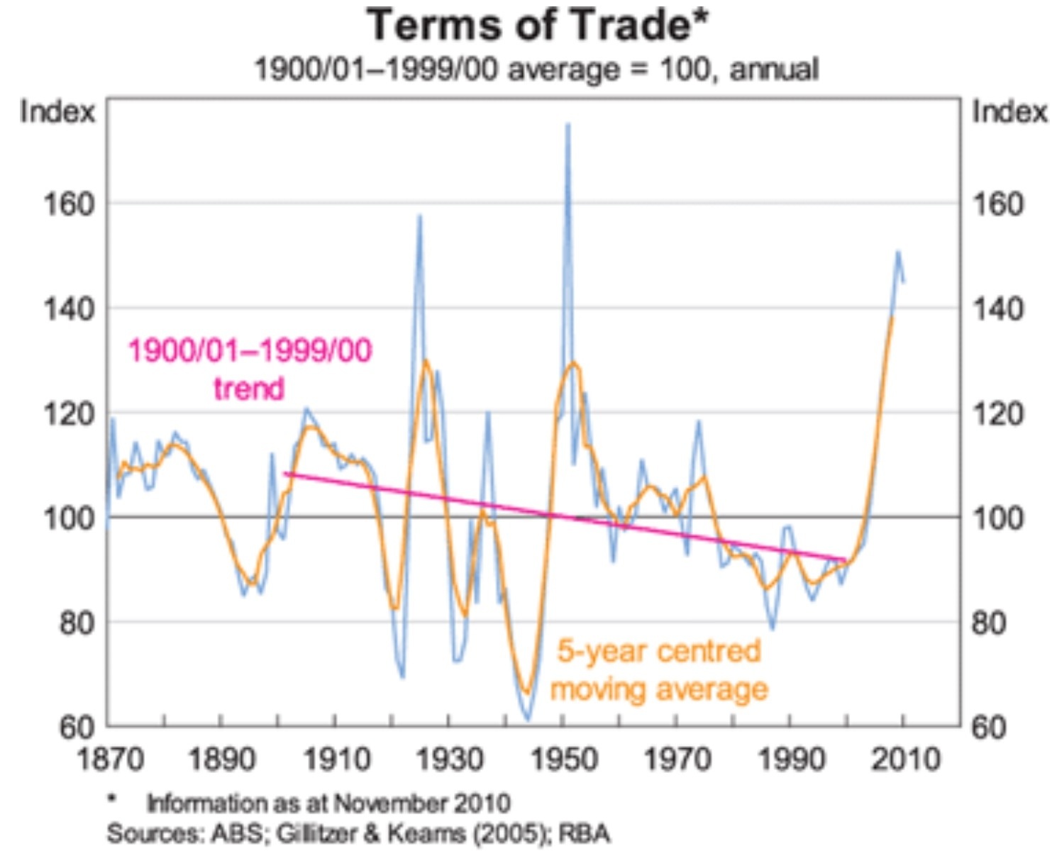 The error bands are fair enough in one sense, but i think the way they have positioned them boarders on abuse. The mid point should have been the long run average, and the error bands should have allowed for the true upside and downside cases: some small persistent increase (to reflect resource scarcity) in the terms of trade; and the probability that resources prices would resume their relative price decline, causing the terms of trade to resume their century long trend-decline (which is what RBA Gov Stevens has been warning of)