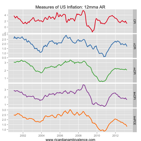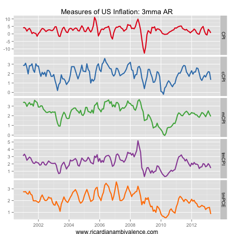 The 3m AR measures of inflation are: CPI 0.7%, core-CPI 1.3%, median CPI 1.9%, trimmed mean CPI 1.4% and trimmed mean PCE 0.9%.