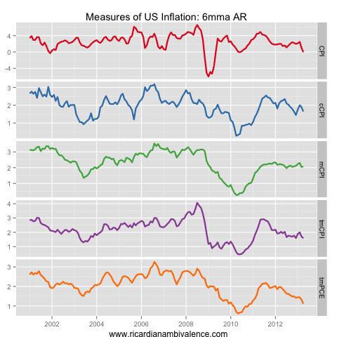 The best measure of inflation (in terms of balancing signal and noise) is the 6mAR, and on this measure, there has been no inflation over the past six months in headline CPI terms.