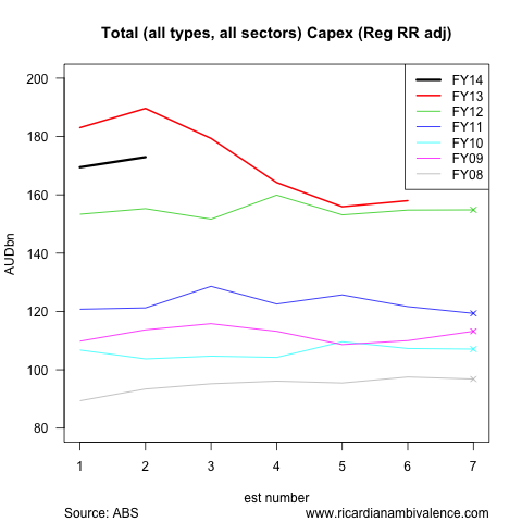 If we take the capex intentions data seriously, the Q1 capex report suggests a 10% increase in the nominal value of private sector capital investment in FY13-14. That’s not what I expected to find …