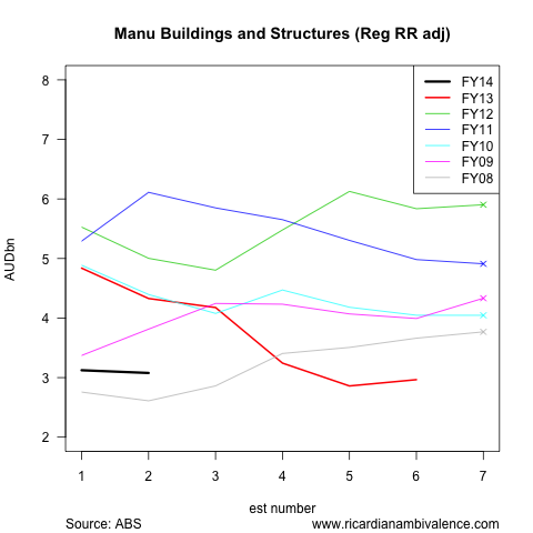 Consistent with the awful manufacturing PMIs, the manufacturing sector does not plan to invest much in FY14 (investment is down ~50% from the peak in FY12). After adjustment, the second estimate for FY14 suggests growth of building and structures investment of ~4% in FY14. This ought to pick up somewhat if the AUD goes down a little further.