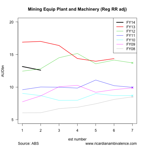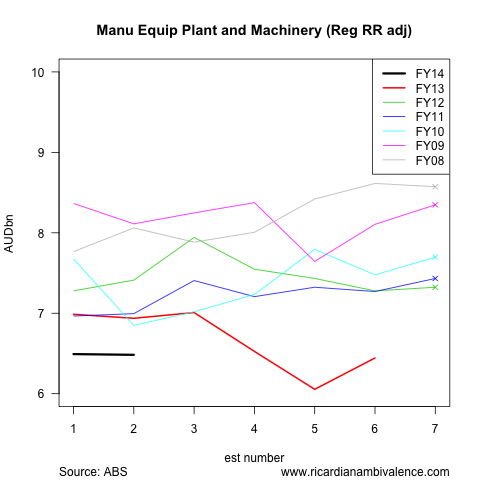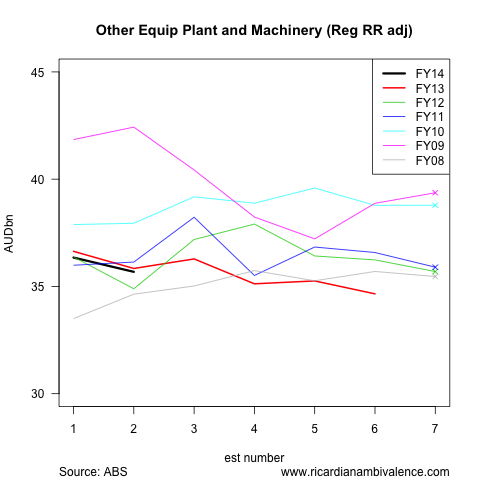 The weakness we have all heard about is clearer in equipment, plant and machinery (EPM) investment. Again, firms tend to under-estimate EPM investment this far out, so the fact that the second estimate for FY14 is 22% below the sixth estimate for FY13 is basically undone by the adjustment process — after adjustment, we end up with a 1.3% decline in EPM investment.