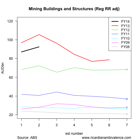 The mining sector is fully responsible for the ongoing growth of building and structures capex. After adjustment, the second estimate for FY14 suggests 17% growth.