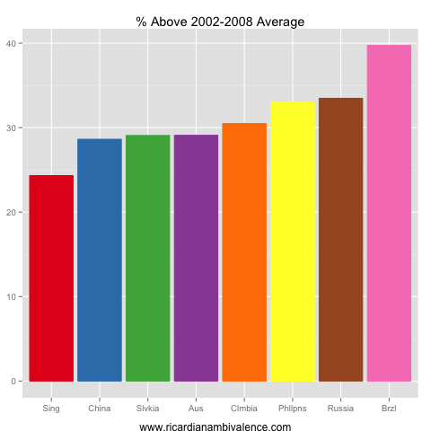 I am surprised at the confusion that surrounds the FX issue — a few months ago, the RBA said that the AUD was over-valued, and cut rates because of it in May. A seven cent decline changes the degree of over-valuation, but not the basic issue … at ~30% higher than the 2002-2008 cycle average, the REER is way too high IF the mining boom is over. We remain at the top of the BIS leader-board for the largest increase in REER this cycle.