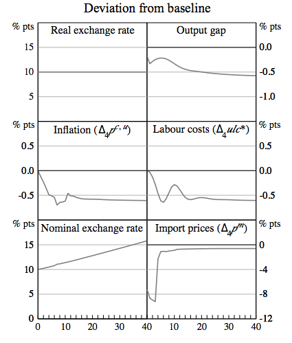 Much of the confusion about policy seems to relate to uncertainty about mapping from FX to interest rates. There are some wild elasticities out there — but the reality (as set out in this RBA RDP) is more mundane. A 10% shock to the REER moves inflation by about 50bps over three years, and moves the output gap by about the same amount. A good deal of the increase in inflation is from import prices, — which may or may not be ignored, depending on the broader context.