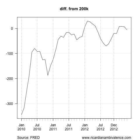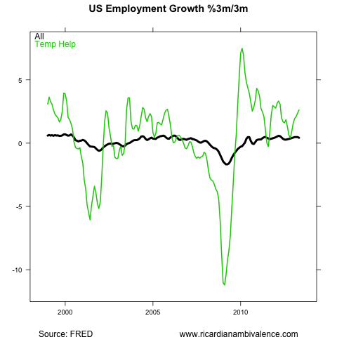 The May estimate looks a little low. The prior 3m average suggests that we ought to be seeing slightly stronger employment growth. Perhaps this is the consequence of the sequestration — meaning that we would be enjoying payrolls jobs growth of ~200k/m if fiscal policy had not tightened so much in Q1.