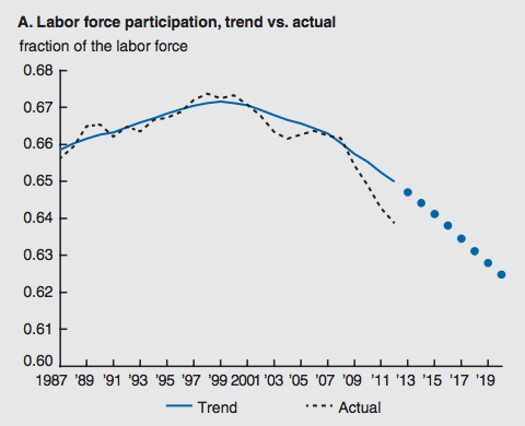The Chicago Fed’s latest economic letter argues that the decline of the participation rate is mostly demographic / structural. While ~65% would be appropriate now, the participation rate is trending down due to demographic factors.
