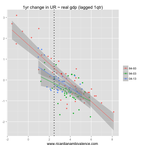 The first ‘model’ (shown above) plots the relationship between GDP growth (measured in YoY terms) and the 1y change in the unemployment rate (lagged one-quarter). To make a concrete example, say GDP growth is ~2%y/y in the year to Q1’13, then history suggests the average unemployment rate in Q2’13 will be ~25bps higher than in Q2’12. At present, it’s gone up a bit more than that despite growth of ~3% in the year to Q4’12 (which is why productivity is looking better!) — and the pace of prior growth suggests the unemployment rate should be steady at around this level, or fall back a little in Q2’13.