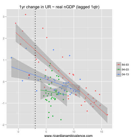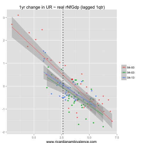 The job ads data is more easily squared with the domestic demand data (recall all the anecdotes about net-exports not employing as many people as investment? … well I agree). Like the GDP measures, we have a robust and consistent relationship between the pace of demand growth and subsequent innovations in the unemployment rate. Indeed, this one is more stable over time. The labour market is presently a bit weaker than you’d expect given the prior pace of demand growth, and the unemployment rate ought to rise further still through Q2 given the abrupt slow-down of domestic demand growth in Q1’13.