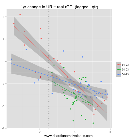 An alternate measure of domestic activity is GNE (which is domestic demand + inventory adjustments). This is basically the same as the domestic demand chart — including it being a similarly consistent relationship though time. At the margin it’s a bit worse: a Q2’13 average unemployment rate of ~6% would fit the historical relationship. This would mean a sharp spike higher of the unemployment rate in Q2’13.