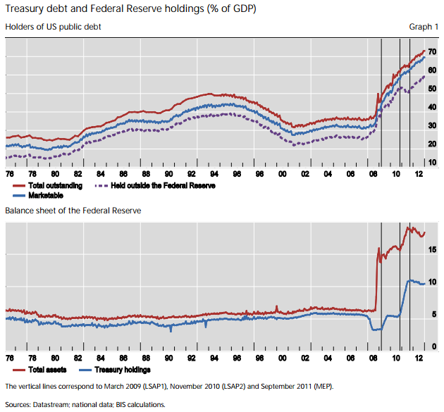 The BIS has just published a paper which traces the main path through which QE works to stimulate the economy. It shows how the size and average maturity of government debt in private hands influences long-term yields, and how the FOMC is working to lower those yields via QE (their LSAPs or large-scale asset purchase program).