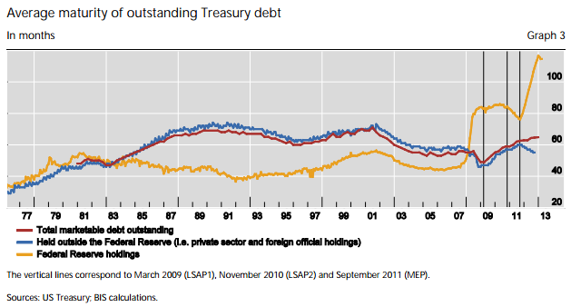 The theory is that the greater the term of the debt the Fed purchases, the greater the boost to the economy (the more duration risk they take out of private sector hands, the more risk the private sector has to seek elsewhere). So when the Fed wanted to boost the economy but was unable to cut rates further, they purchased a greater share of longer term bonds — you can see the particular impact of twist on the portfolio in 2011.