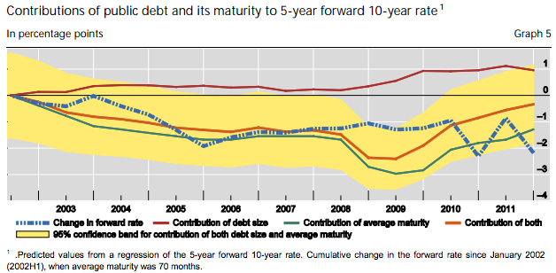 Splitting the contributing factors up by type, the increase in the stock of debt on issue has worked to increase long-term UST yields, while the decline of the average maturity of debt held in private hands has worked to decrease bond yields (again, note that the actual decline is a little larger than can be explained by these two effects).