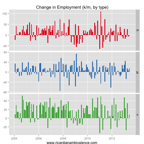 The part-time / full-time movement from month to month is mostly noise. The big picture remains a slow uptrend in total employment, which is too slow to stop the unemployment rate from rising.