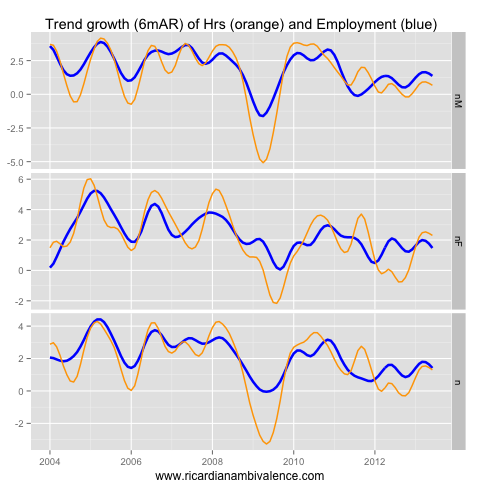 If anything, trends suggest labour market weakness is increasing, following a period where labour market weakness was ebbing (which I guess means there is no long-term trend … it’s just sideways at too weak). Both employment and hours worked trends are turning down again.