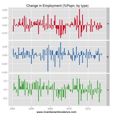 If we re-express the above chart to take out the impact of population growth (so we look at the change at the proportion of the population in either class of work) you can see that FT work is not keeping up with population growth; part-time jobs are growing at a similar pace to the population, leading to a slow decrease in the proportion of the population in work.